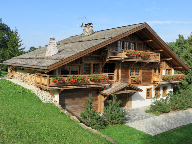 Fabrication et pose d'un chalet en ossature poteaux/poutres en épicéa et vieux bois à Megève