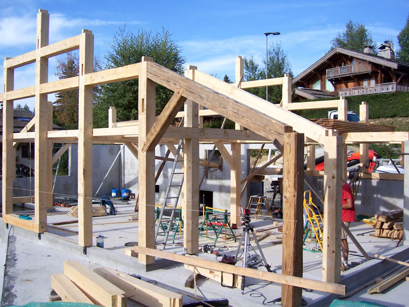 Fabrication et pose d'un chalet à ossature bois poteaux/poutres en épicéa, à Combloux
