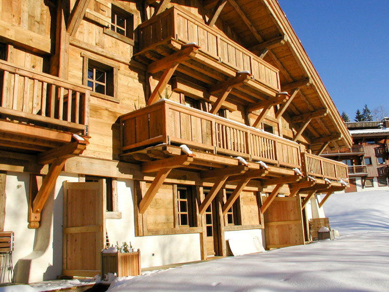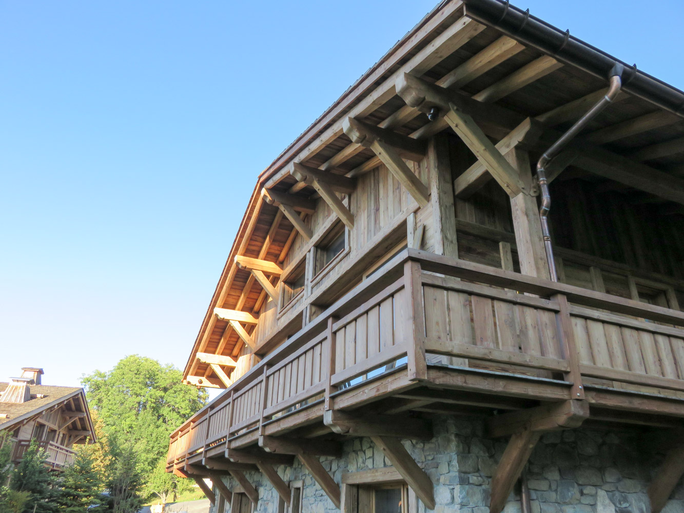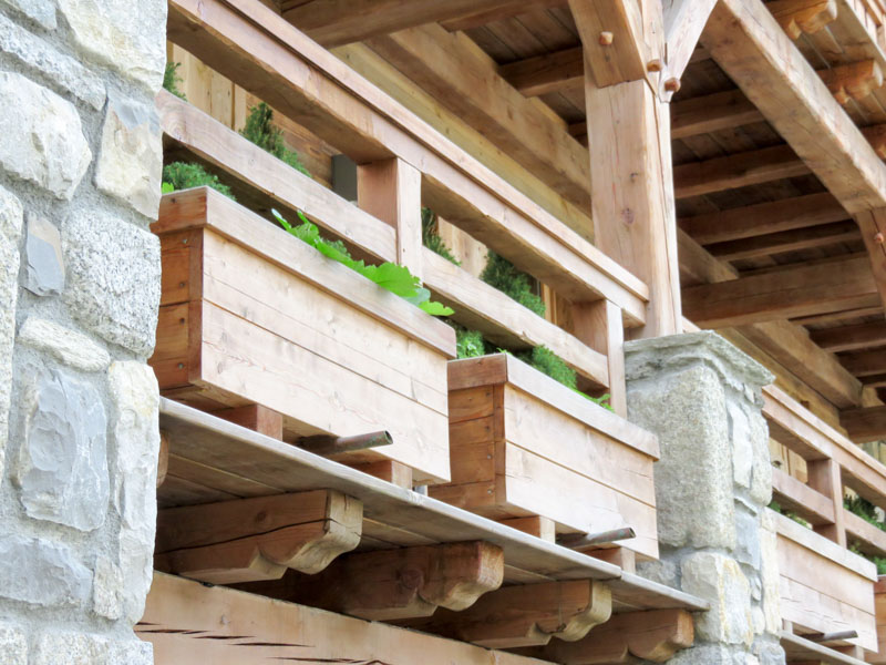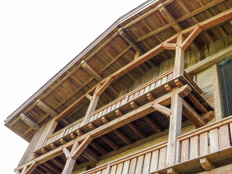 Balcon décoratif et faux cadres à linteaux cintrés en vieux bois. Megève |